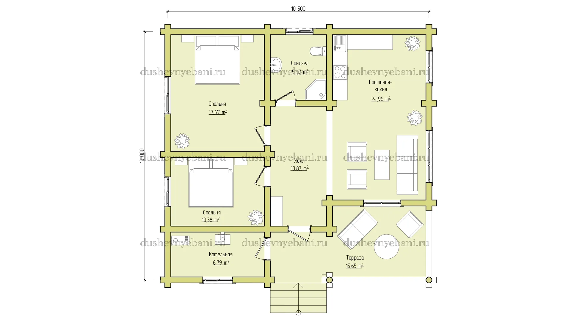 Дом из бревна 10 на 10.5 м — это просторный и светлый деревянный дом для большой семьи. «Душевные Бани» строим такие дома под ключ недорого в Удмуртии и Ижевске. Площадь позволяет разместить все необходимые зоны комфортно.
